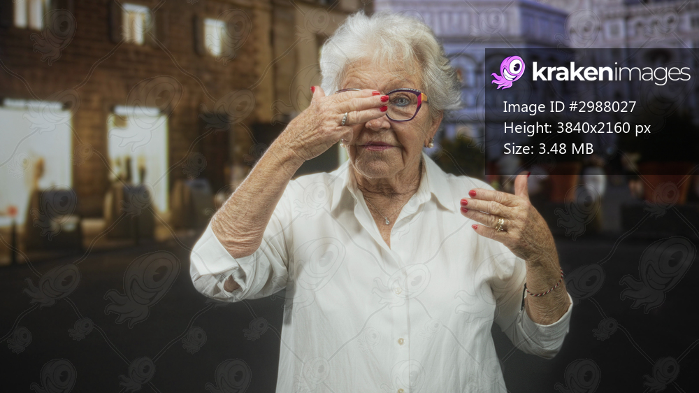 Elderly woman covers eyes with hand while adjusting glasses and gesturing with other hand on a city street at night, wearing white shirt and red nails; nostalgia memory. - Kraken Images
