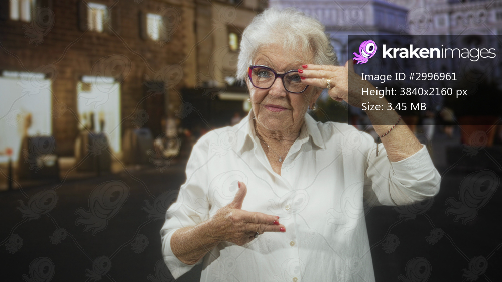 Elderly woman covers eyes with hand while adjusting glasses and gesturing with other hand on a city street at night, wearing white shirt and red nails; nostalgia memory. - Kraken Images