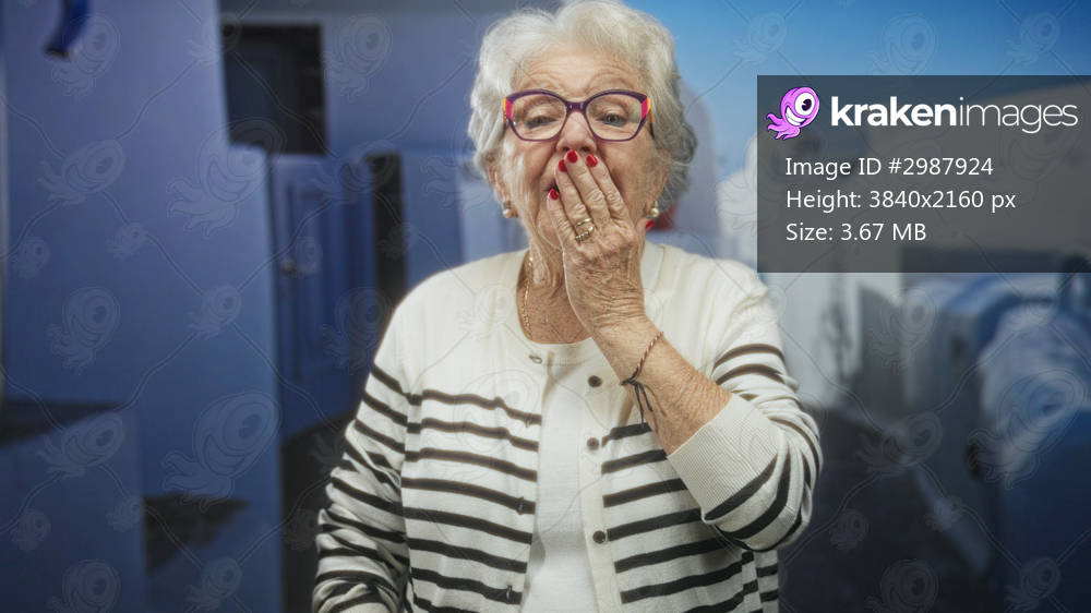 Elderly woman covers mouth with hand, wearing glasses and striped cardigan in studio with mediterranean backdrop; surprise reflection.
