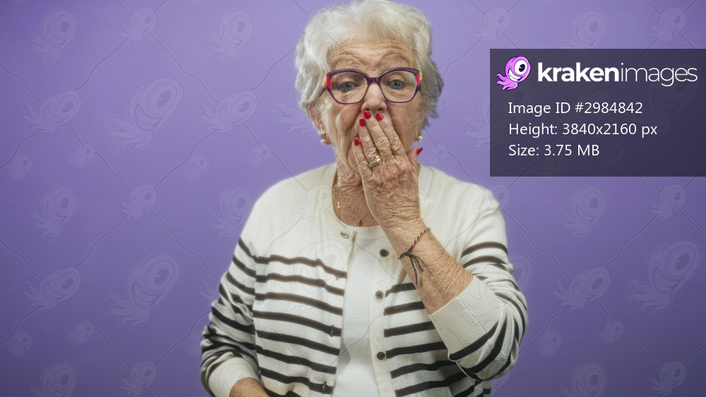 Elderly woman covers mouth with hand while wearing striped cardigan and colorful glasses in a studio backdrop, red nails and rings visible; surprise.