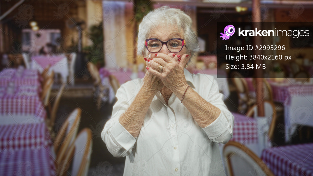 Elderly woman covers mouth with hands in a restaurant building with checkered tablecloths and chairs; surprise memory.