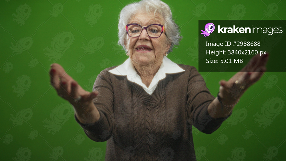 Elderly woman crosses arms hugging chest, hands with red nails and rings visible in green studio; warmth contentment.