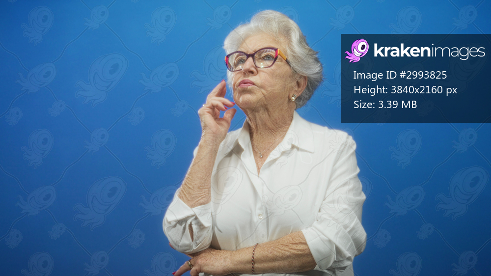 Elderly woman with finger to chin thinking in a blue studio wearing glasses and a white shirt; thoughtful reflection.