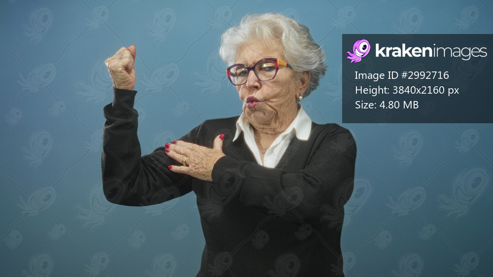 Elderly woman flexes fist and presses hand to upper arm while puckering lips, wearing glasses and red nail polish in a blue studio portrait; confidence. - Kraken Images