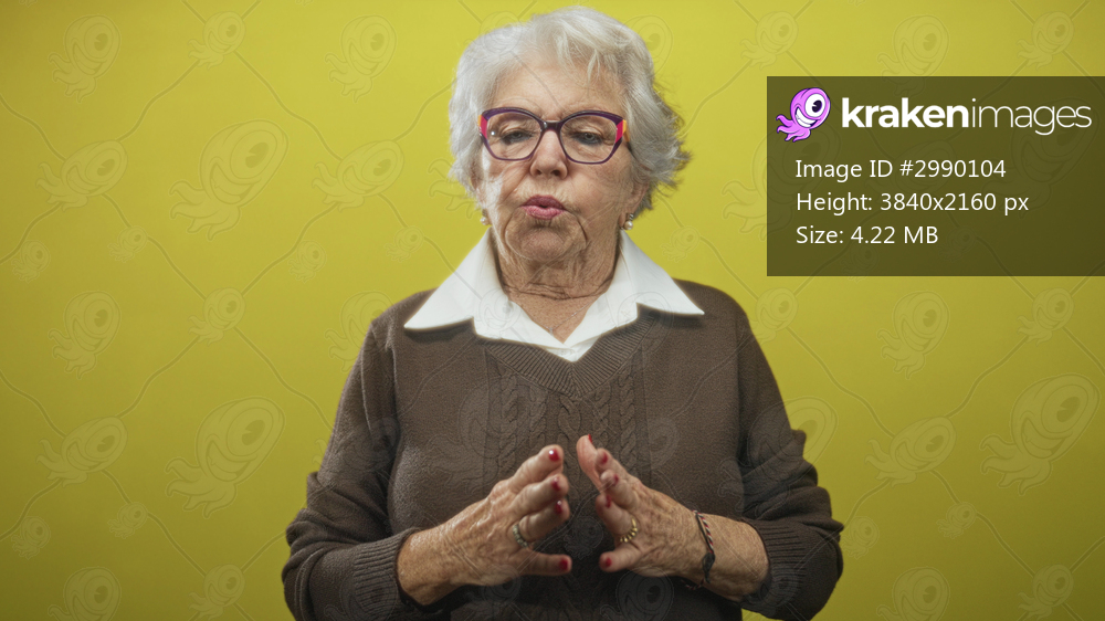 Elderly woman folding hands and steepling fingers in a yellow studio portrait, wearing glasses and brown sweater against plain backdrop; contemplative wisdom. - Kraken Images