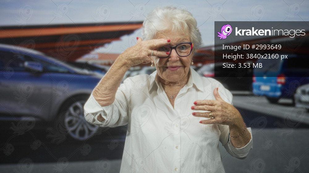 Elderly woman frames her eye with one hand and adjusts glasses while smiling in a covered parking area beside parked cars on street; playful curiosity. - Kraken Images