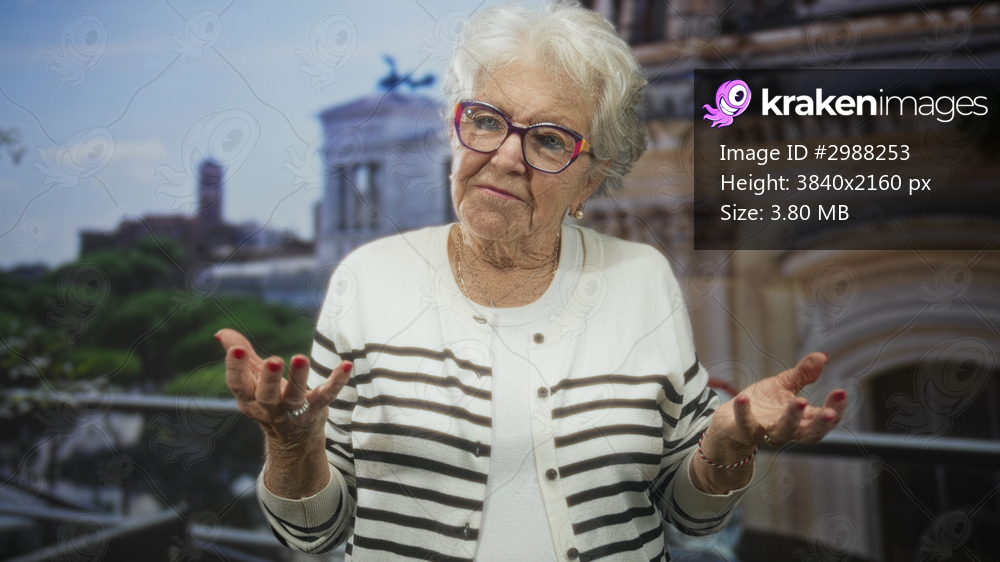 Elderly woman gesturing with open hands on a balcony in front of ornate building, wearing glasses and striped cardigan; pensive.