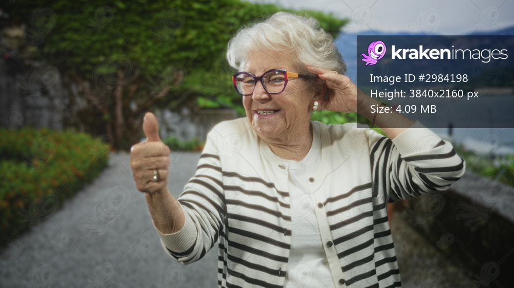 Elderly woman gives a thumbs up with one hand and cups her ear with the other while standing on a street path beside a lake and distant mountains; warmth joy. - Kraken Images