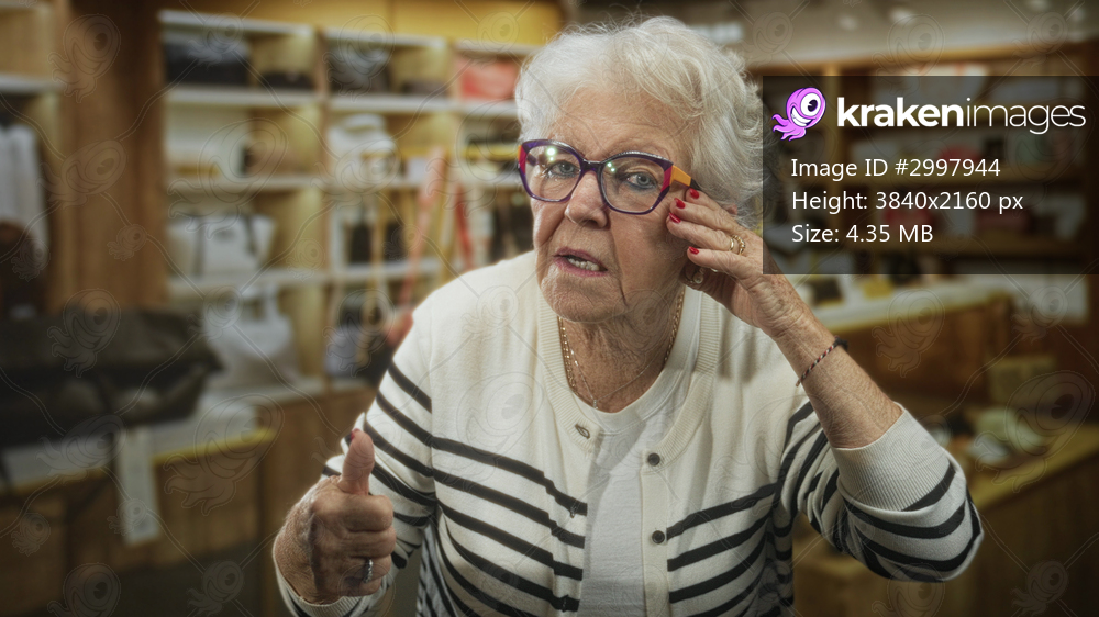 Elderly woman gives thumbs up with bare hand and adjusts colorful eyeglasses among purse shelves in a boutique building; cheerful approval.