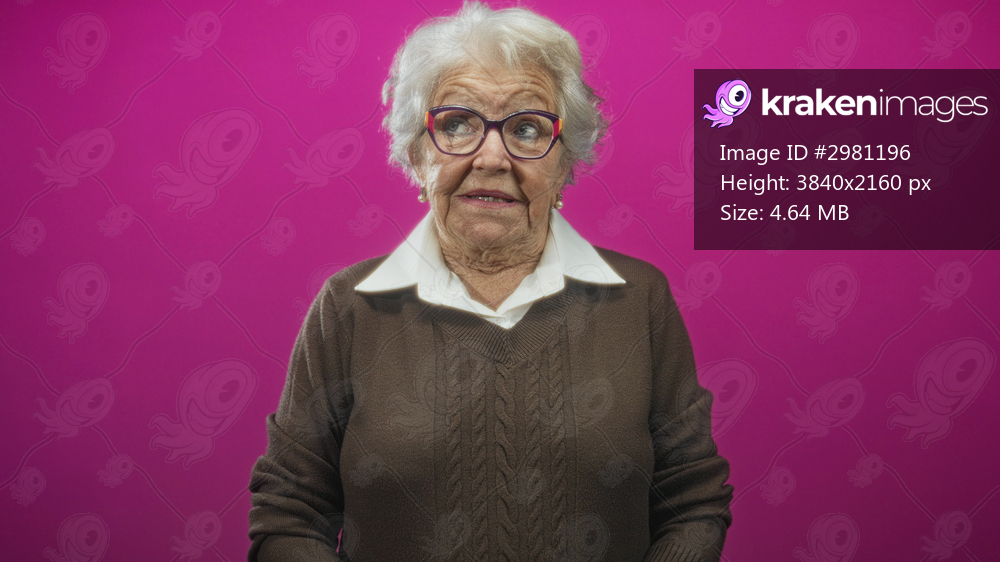 Elderly woman with glasses looking at camera in magenta studio, wearing brown sweater and white collared shirt; quiet wisdom.