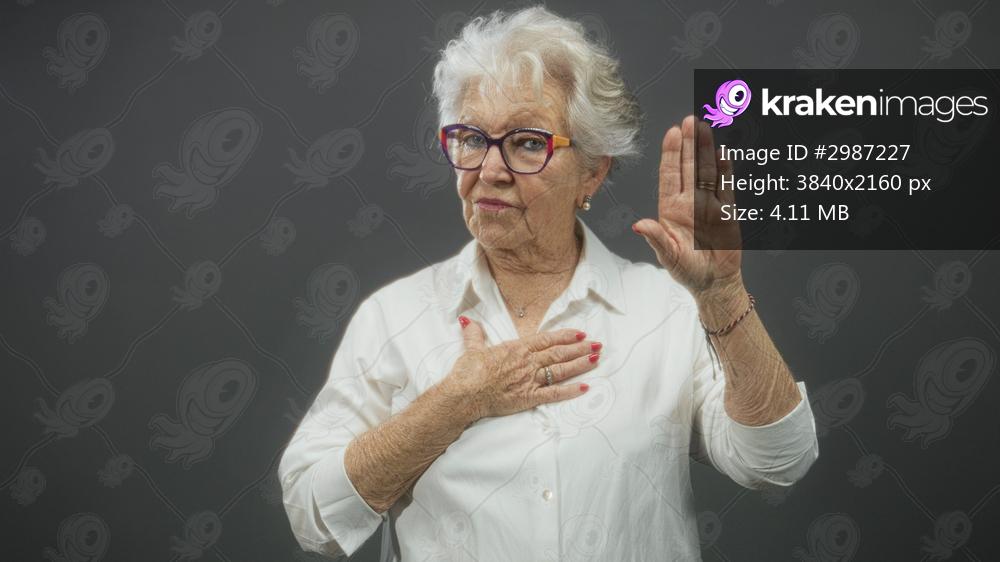 Elderly woman with glasses places hand on chest and raises palm in oath gesture in studio; honor sincerity.
