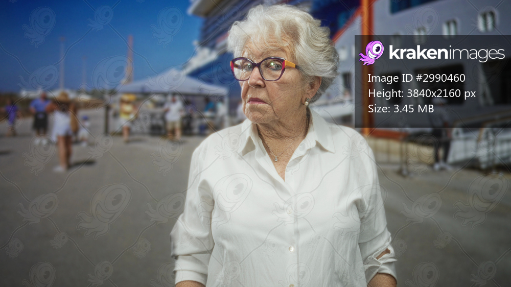Elderly woman with glasses standing and looking at camera on a street near a cruise ship; quiet contemplation.