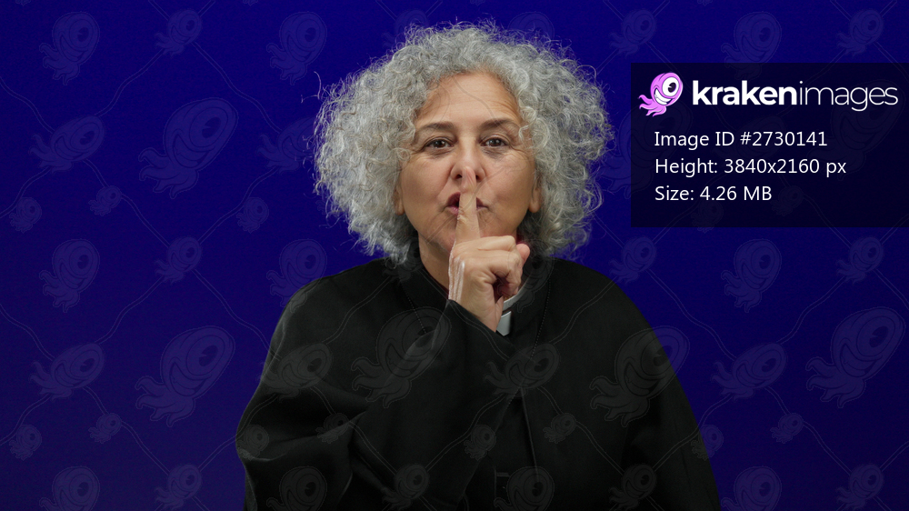 Elderly woman with grey hair gestures silence against an isolated blue background, conveying calm and tranquility.