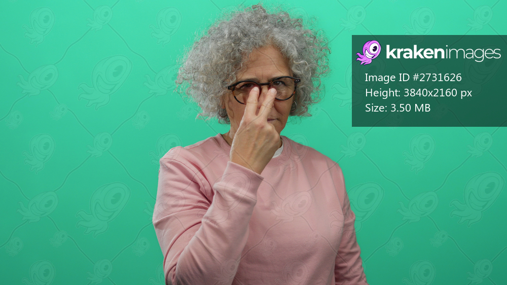 Elderly woman with grey hair gesturing vigilance against a green background, wearing glasses and a pink sweater, adds an intriguing focus to social awareness. - Kraken Images
