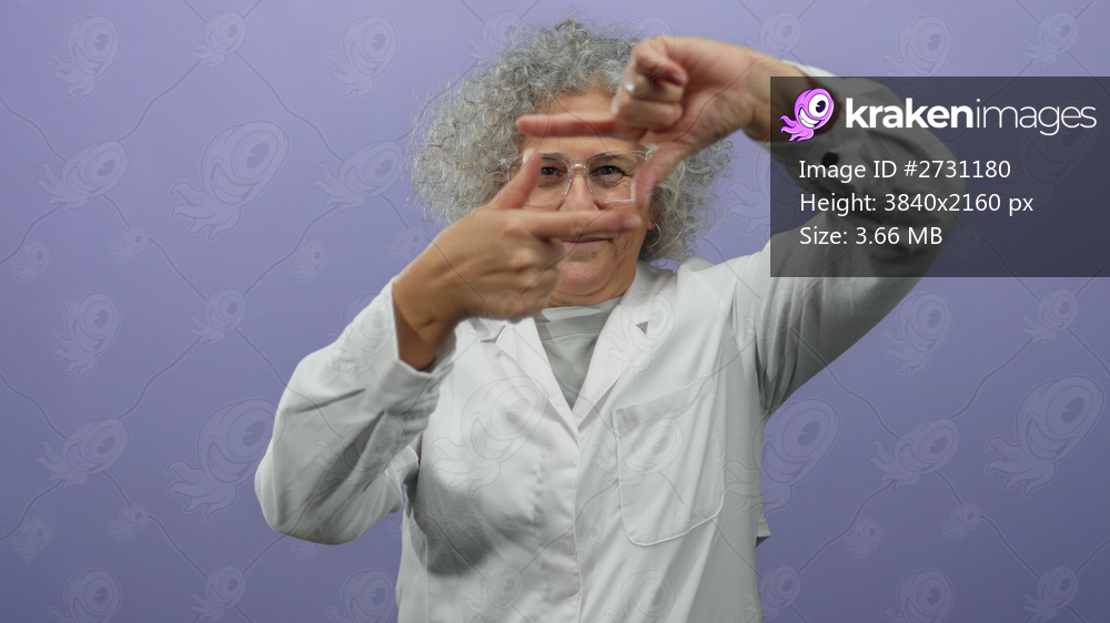 Elderly woman with grey hair and glasses frames a gesture with her fingers against a purple isolated background wearing a white coat implying focus and creativity. - Kraken Images