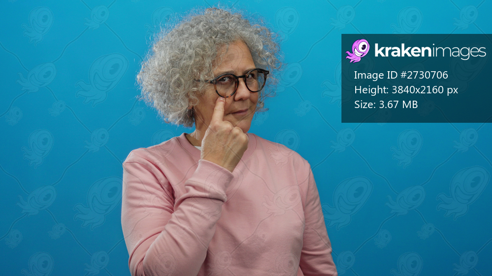 Elderly woman with grey hair and glasses gestures thoughtfully against isolated blue background.
