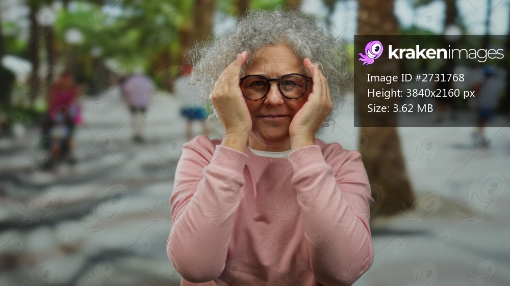 Elderly woman with grey hair and glasses in a pink sweater expressing frustration on a bustling city street, surrounded by blurred urban scenery and passing pedestrians. - Kraken Images