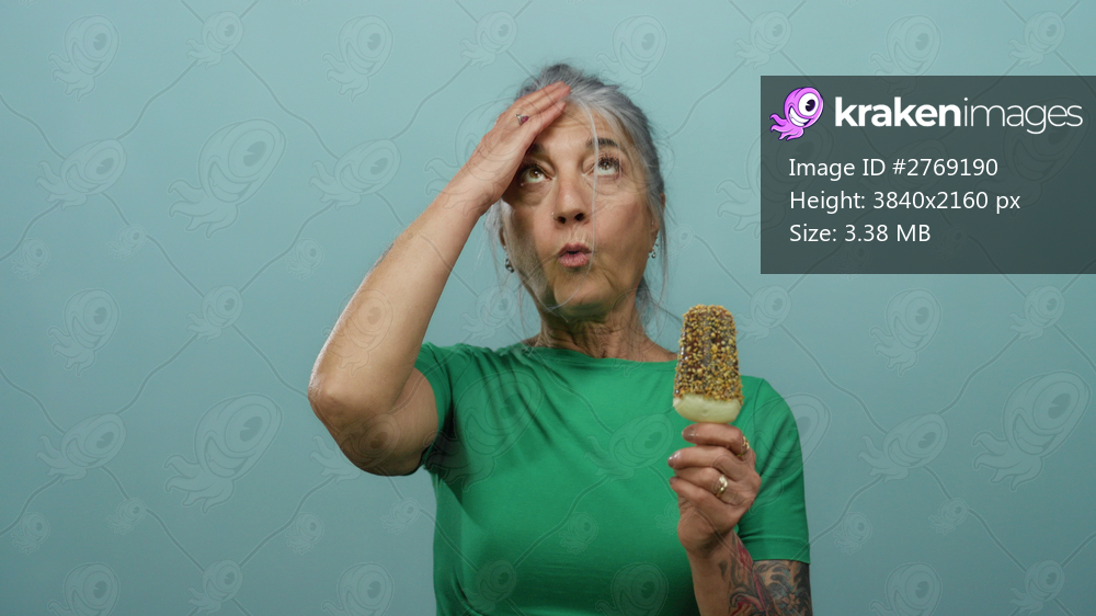 Elderly woman with grey hair in a green shirt holding an ice cream bar against a blue background, looking expressive and isolated with a surprised demeanor. - Kraken Images