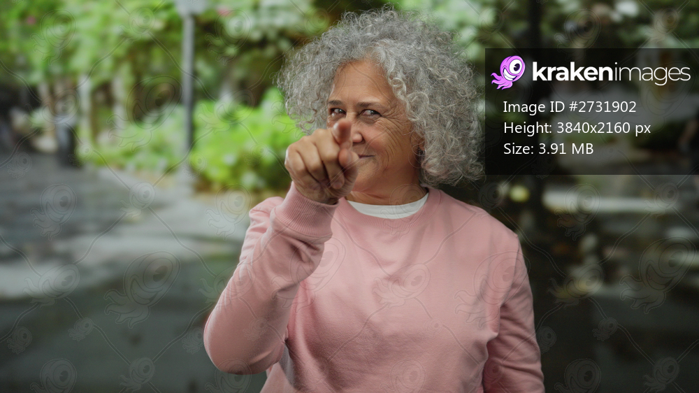 Elderly woman with grey hair in a pink shirt makes a watchful gesture, standing in a lush green park with trees and a pathway visible in the background. - Kraken Images