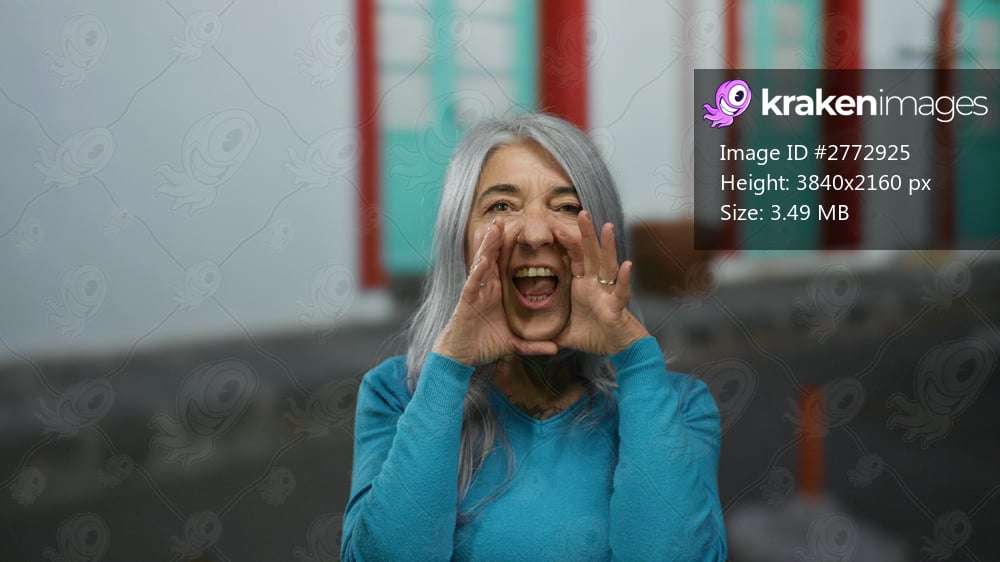 Elderly woman with grey hair in blue sweater shouting on a vibrant street with colorful doors and windows outdoors in lively urban setting.