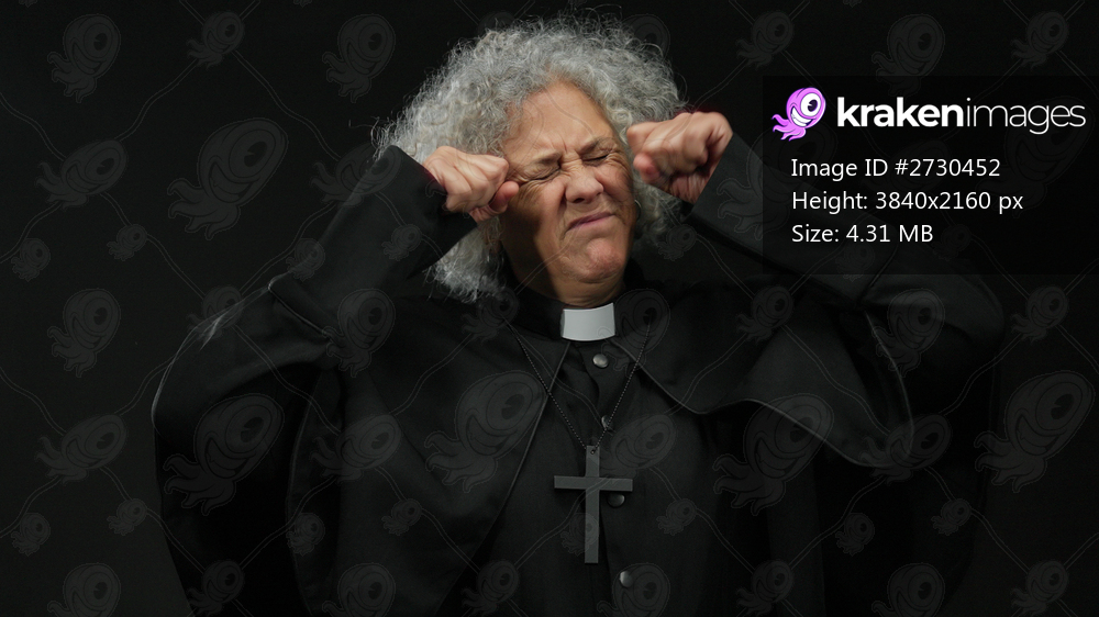Elderly woman with grey hair in religious attire makes crying gesture against a black background, conveying emotion and introspection.