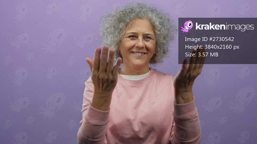 Elderly woman with grey hair makes a hand gesture against an isolated purple wall background wearing a pink sweater smiling gently.