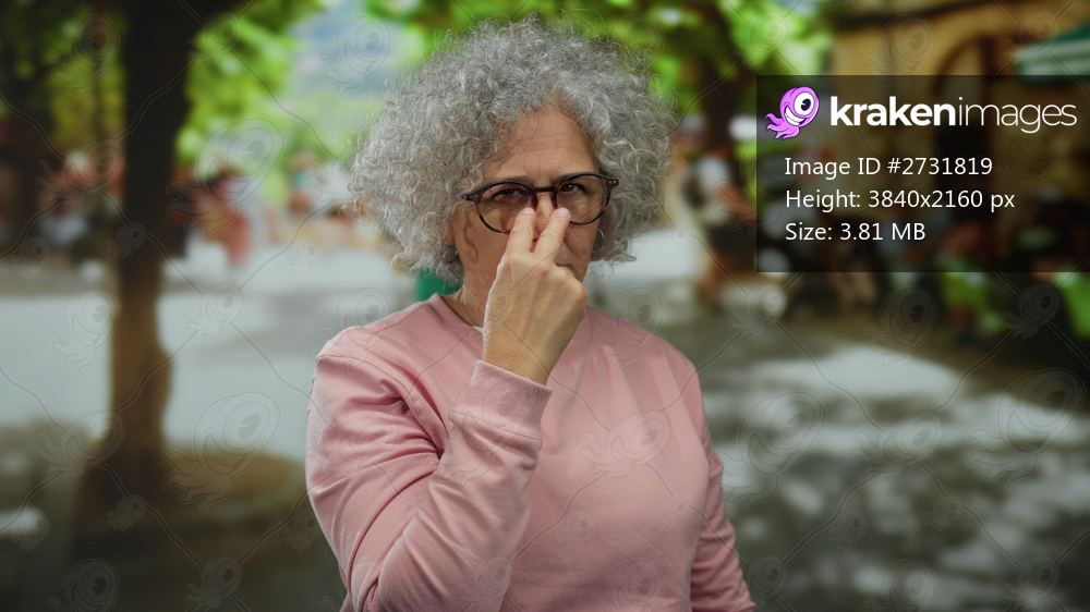 Elderly woman with grey hair makes a vigilant gesture on an urban street, showcasing attentiveness amid the city landscape.