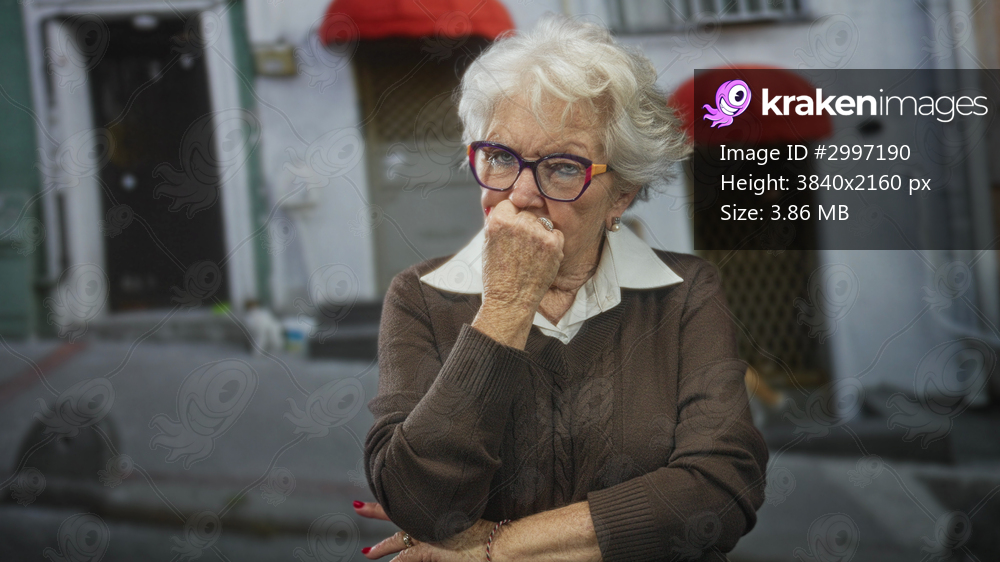 Elderly woman with hand to mouth gesture on a street, wearing glasses and brown sweater by a storefront red awning; pensive reflection.