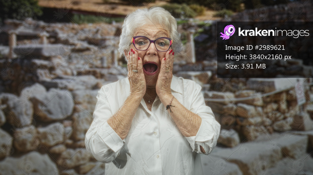 Elderly woman with hands pressed to cheeks, mouth open and wide eyed, colorful glasses, red nails and rings in front of stone building ruins; surprise. - Kraken Images