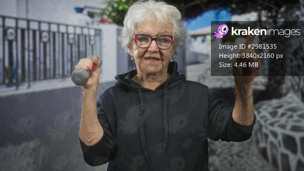 Elderly woman holding 1kg dumbbell and pointing finger in a narrow street by white stone building, wearing glasses and hoodie; confidence active aging. - Kraken Images