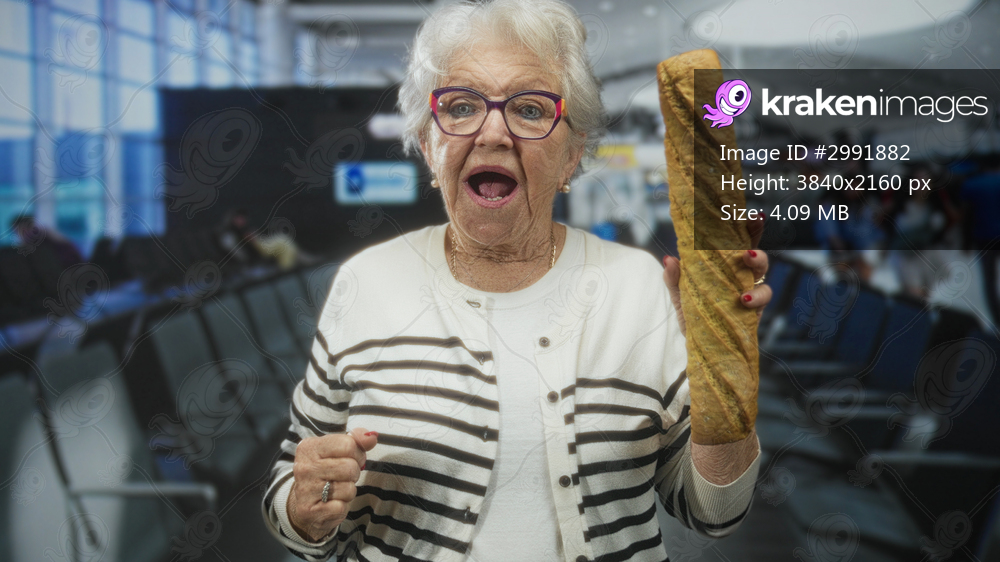 Elderly woman holding a long baguette upright, mouth open and raised hand in airport terminal, striped cardigan; surprise.