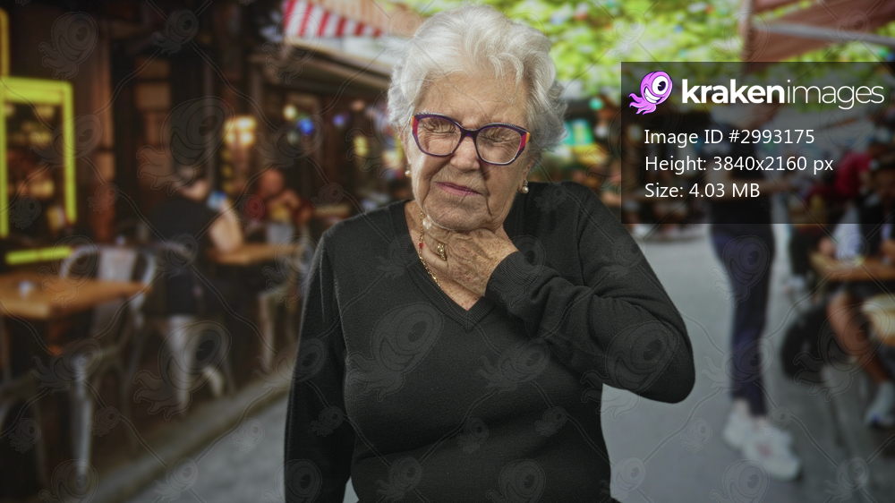 Elderly woman holding her throat with one hand and closed eyes at a busy street cafe wearing glasses and black sweater; distress health concern.