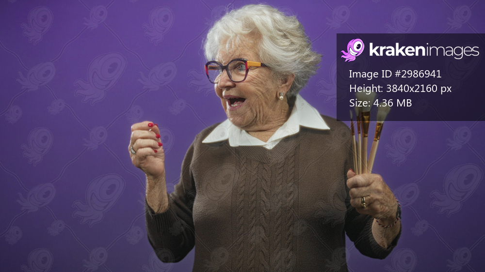 Elderly woman holding makeup brushes and gesturing with hands in a studio purple backdrop, wearing glasses and sweater; creative joy.