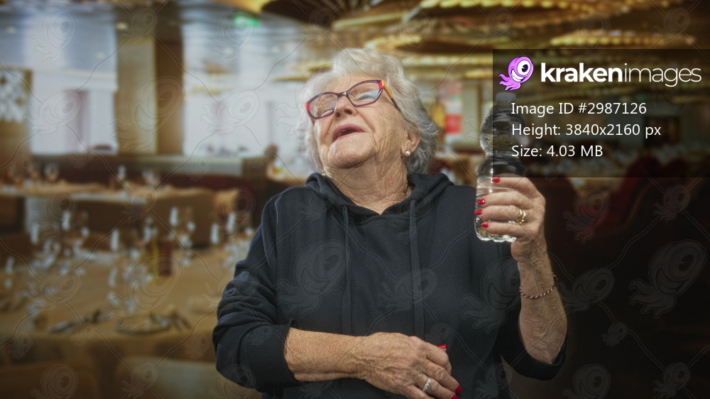 Elderly woman holding plastic water bottle, hand on stomach, smiling and raising bottle in restaurant; relief hydration comfort.
