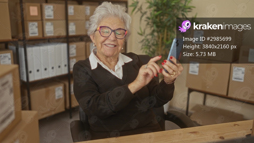Elderly woman holding smartphone raising fist in building filled with boxes and shelving; ecommerce success joyful.