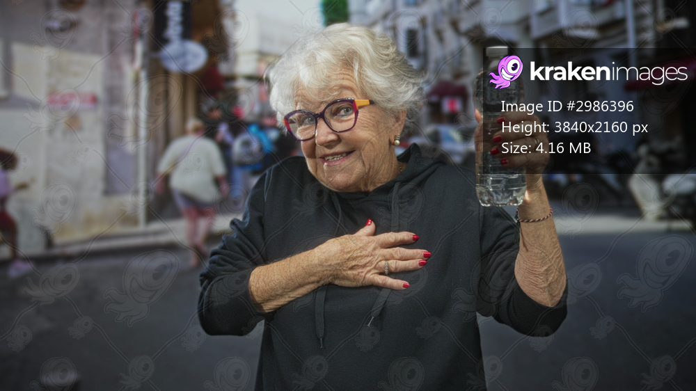 Elderly woman holding water bottle with one hand and hand on chest, wearing glasses and hoodie on a busy street; relief gratitude.