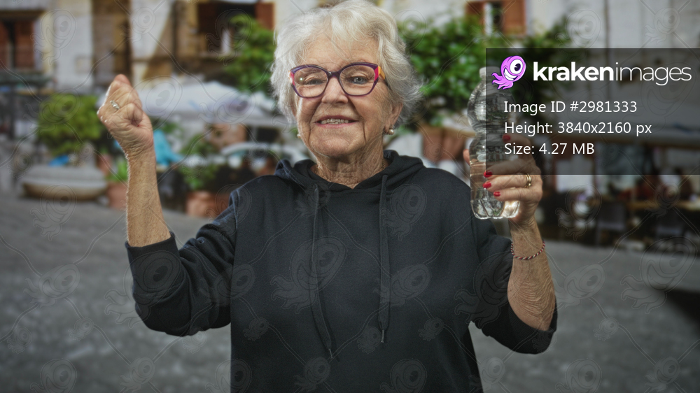 Elderly woman holds a plastic water bottle and clenches her fist, showing hand gesture and glasses in a street cafe plaza; cheerful resilience.