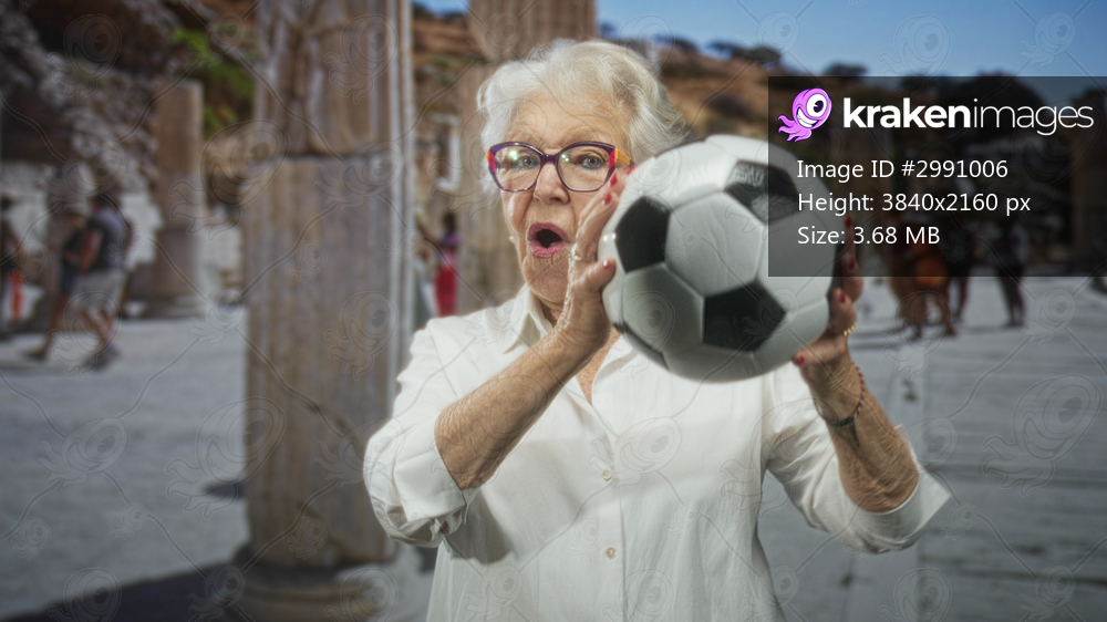 Elderly woman holds a soccer ball above her head on a stone street framed by ancient columns; playful joy.