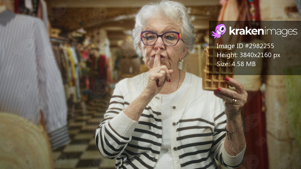Elderly woman holds a waffle in one hand and places a finger to lips for silence while standing in a crowded indoor building aisle; quiet secret.