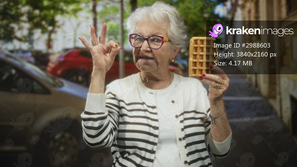 Elderly woman holds a waffle and makes ok sign on a city street near parked cars and trees, smiling subtly; approval warmth.