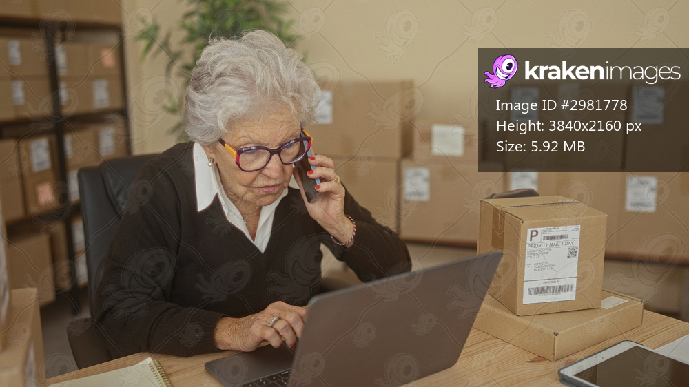 Elderly woman holds phone to ear and types on laptop amid stacked shipping boxes and pallet shelves in a building; determination entrepreneurship.