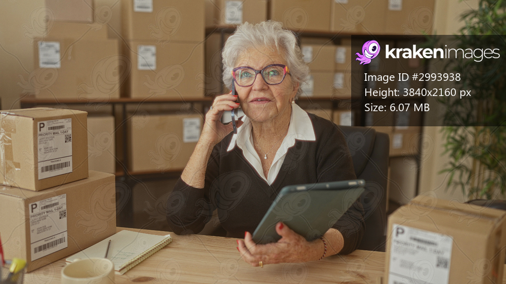 Elderly woman holds phone to ear while checking a tablet amid stacked shipping boxes in a building packing area; determination entrepreneurship.