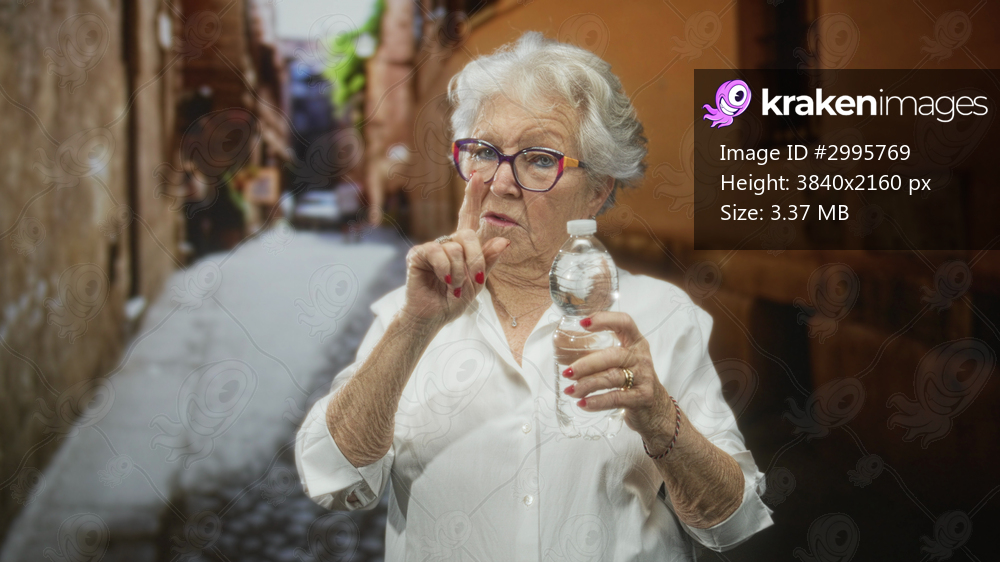 Elderly woman holds water bottle and touches head with hand while giving thumbs up in narrow street, wearing glasses and white shirt; confidence refreshment. - Kraken Images