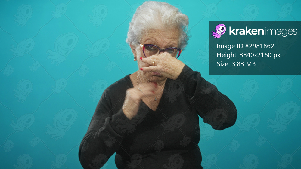 Elderly woman in black sweater pinches her nose with hand and closes eyes in turquoise studio beside glasses; disgust aversion.