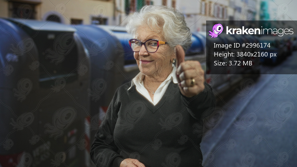 Elderly woman in glasses and dark sweater shows thumb down with red painted nails on a city street beside large recycling bins and parked cars; disapproval. - Kraken Images