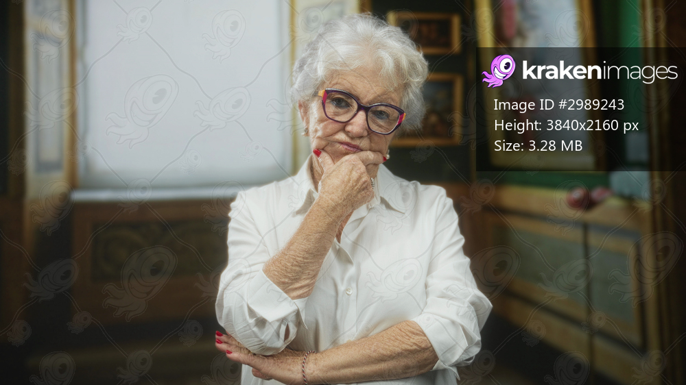 Elderly woman in glasses touches chin and crosses arms amid framed paintings in a building; thoughtful reflection.