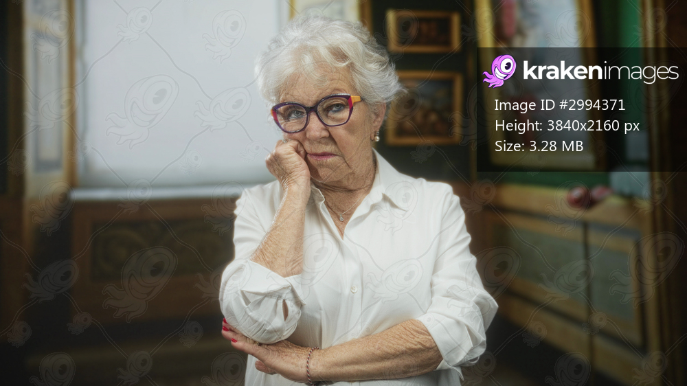 Elderly woman in glasses touches chin and crosses arms amid framed paintings in a building; thoughtful reflection.