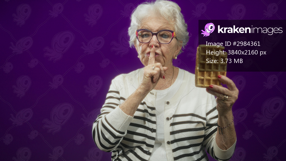 Elderly woman in striped cardigan and glasses holds a square waffle and presses her index finger to lips in a studio shushing pose; playful secret.