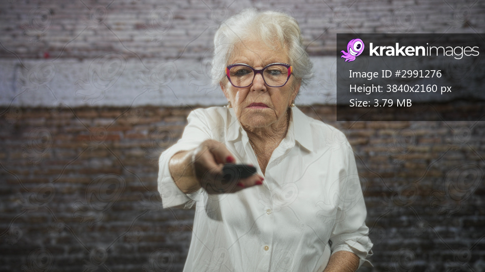 Elderly woman in white blouse points a tv remote toward camera with stern face and extended arm in studio; independence annoyance.