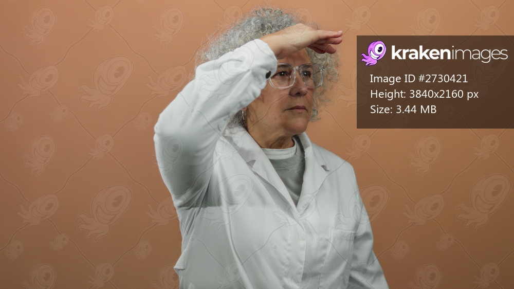 Elderly woman in white coat with grey hair standing against brown wall, looking into distance thoughtfully, isolated and focused.